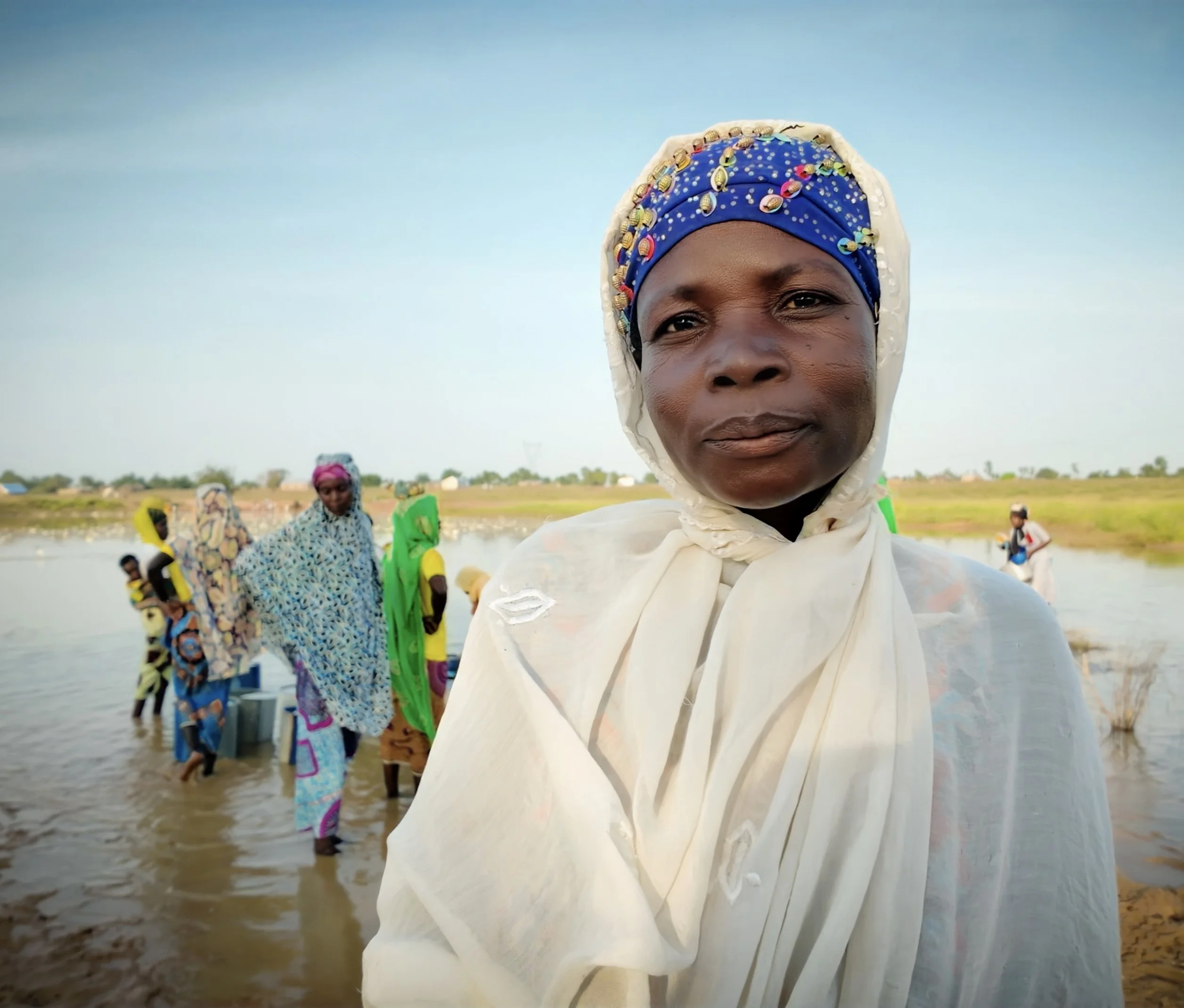 Hamidau’s mother, Sanatu at the dirty pond which is their water source. The water makes them sick but they have no choice. Access to clean water will increase community health.